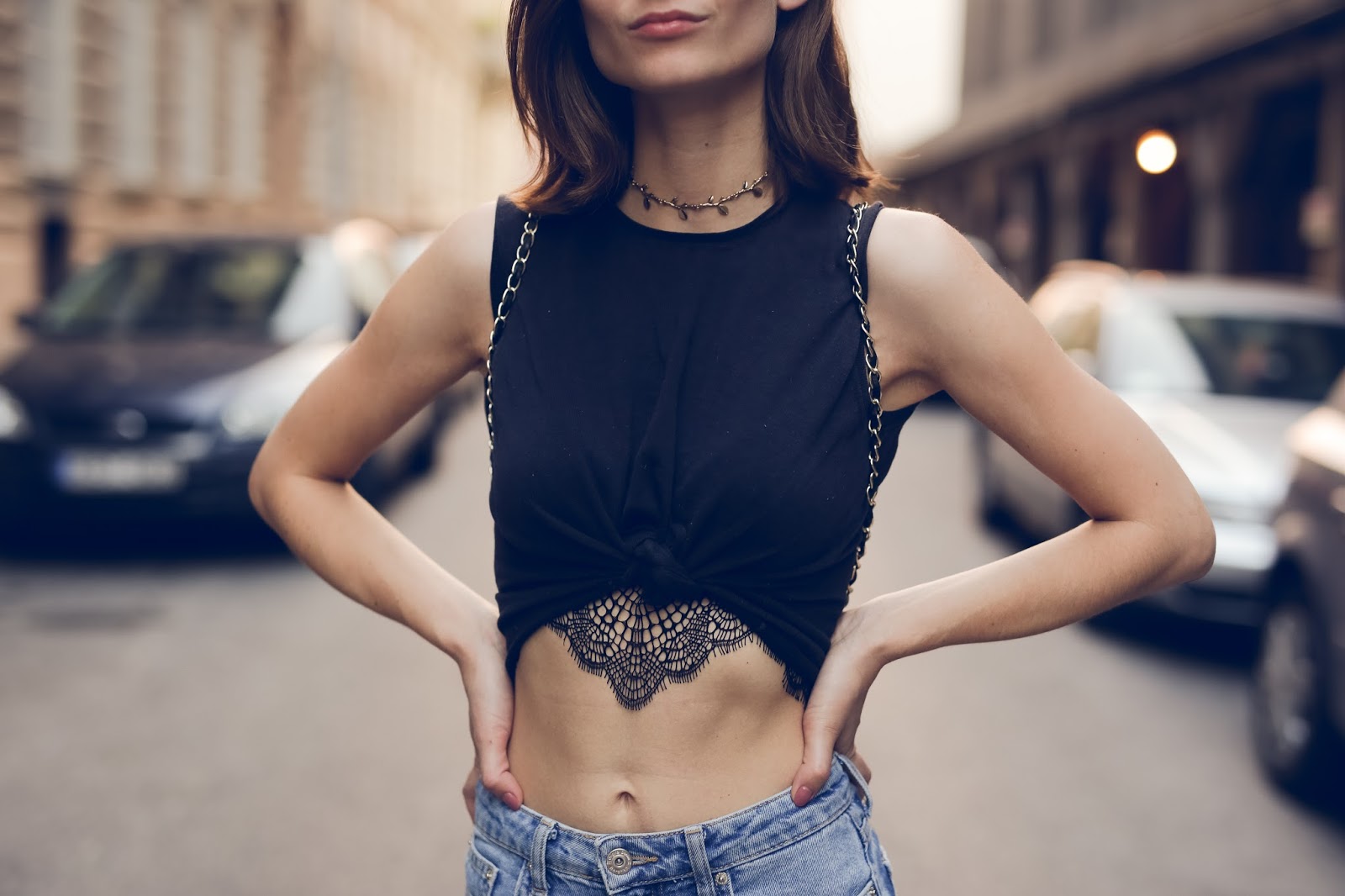 So just pair the lace bra with a crop top or any top that you can tie up for the lace to show.